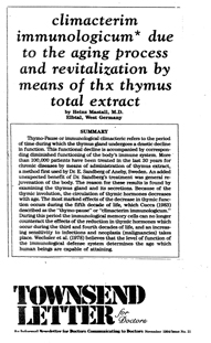 The expression thymus therapy stands for standard injection of specific thymus hormones, the so-called thymus peptides. Thymus therapy is an important, if not the most important non-specific base immunotherapy. This therapy causes activation and balancing of cell defense. Thymus therapy goes back to Dr. Elis Sandberg, Sweden, who already achieved notable success in the treatment of chronic deseases and cancer with his use of the macromolecular THX (thymus total extract) in 1938. By the 80's, Sandberg had successfully treated over 50,000 patients. In many patients he additionally noticed an euphoric and anti-aging effect.